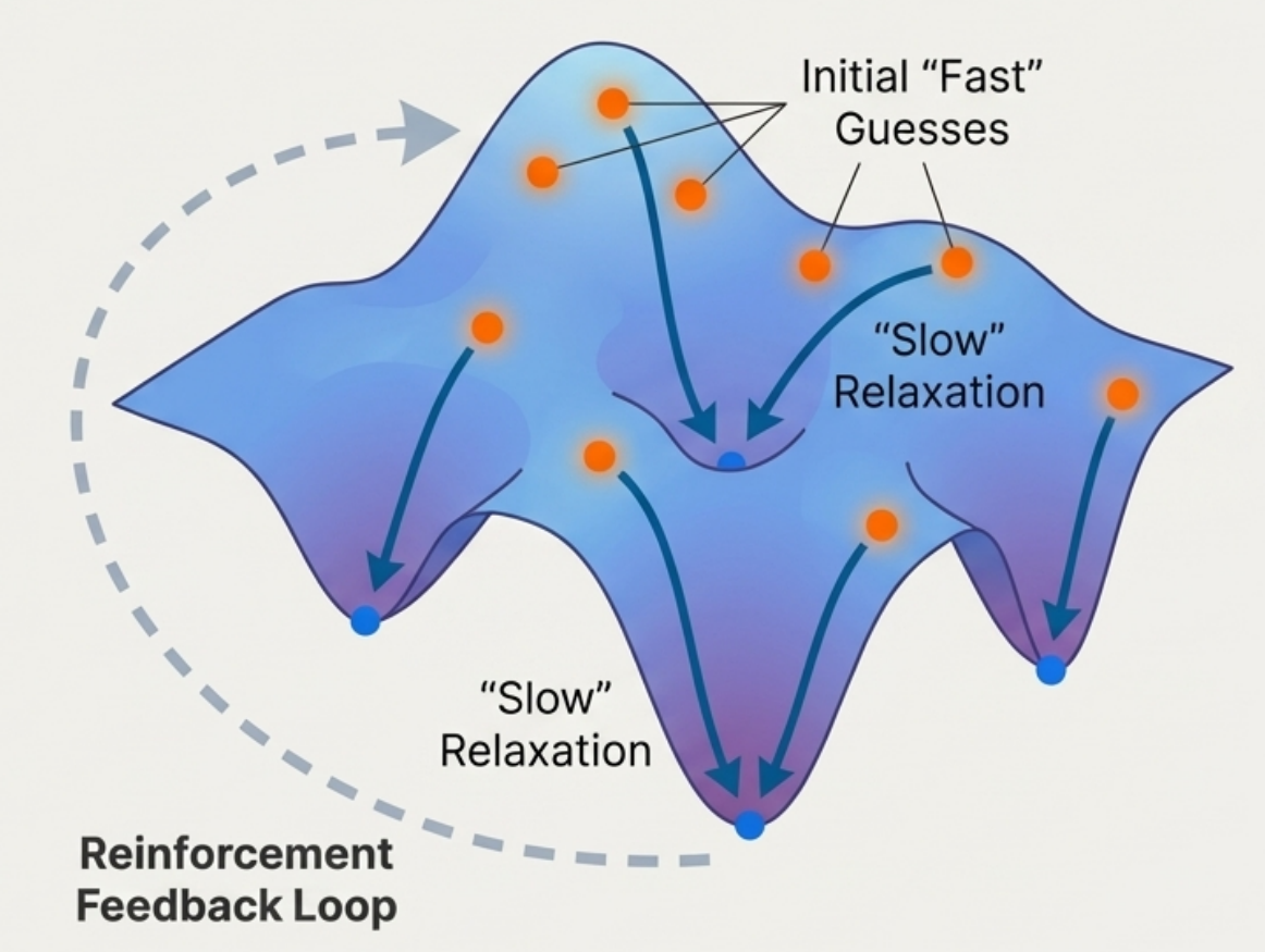 As shown in the figure below: on the blue potential energy surface, the orange points represent the initial guesses rapidly generated by System 1, and the dark blue arrows indicate the relaxation process of System 2, where the structures “slide” along the surface toward local minima (blue points). The gray dashed lines on the left represent the feedback loop of reinforcement learning: the energy information after relaxation is fed back to the generative model via policy gradient algorithms, enabling System 1 to no longer merely imitate training data, but to gradually learn to generate structures that are more physically stable.