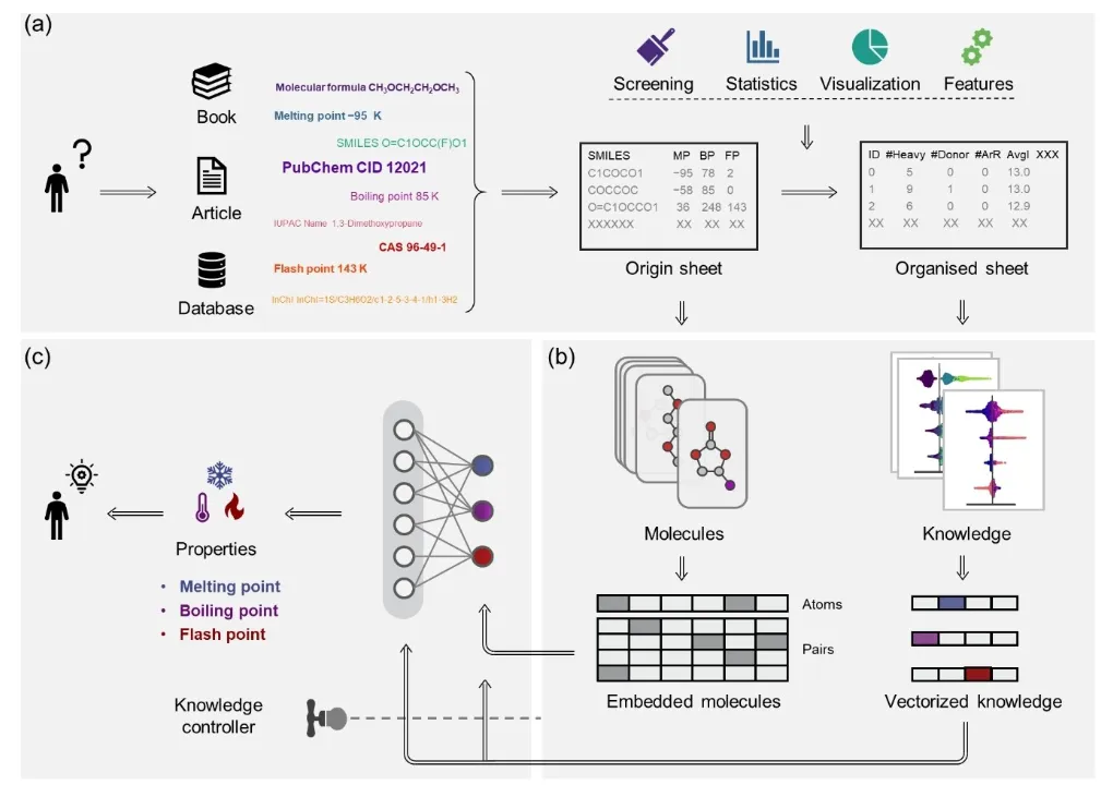 In this paper, the research team developed an innovative approach called the Knowledge–Data Dual-Driven Framework (KPI) for predicting the molecular properties of secondary battery electrolytes. The KPI framework consists of three main modules: data organization and statistical analysis, interpretability and knowledge discovery, and knowledge-based molecular property prediction. First, the KPI framework collects molecular structure and property data from public databases and literature and automatically organizes it into structured datasets. Next, it employs interpretable machine learning methods to explore structure–property relationships from a microscopic perspective. Finally, the discovered knowledge is embedded into property prediction models.