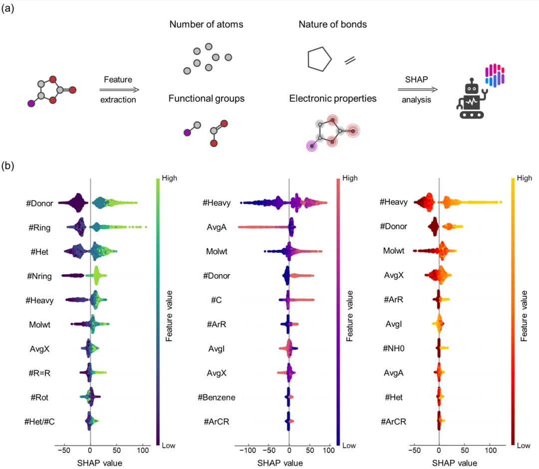Figure 2 uses the SHAP algorithm to analyze the contributions of molecular features to melting point, boiling point, and flash point, identifying the key factors influencing model decisions. The study extracted 64 molecular descriptors (e.g., number of atoms, bond properties, functional groups) and focused on the top ten important features for each property.