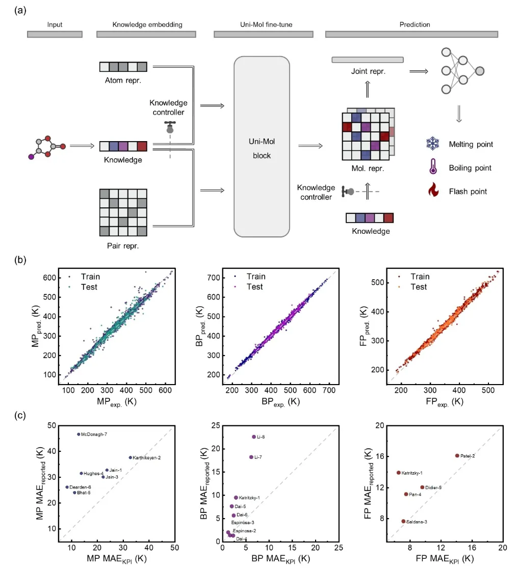 The figures display the prediction results for melting point, boiling point, and flash point, with training and test sets distinguished by color. Data points closer to the diagonal line indicate higher prediction accuracy. The integration of Uni-Mol’s robust molecular representation capabilities with embedded knowledge significantly improves prediction precision.