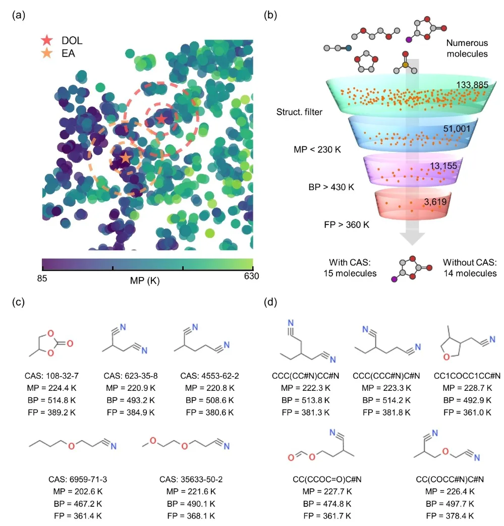 The fine-tuned Uni-Mol achieves high accuracy in predicting molecular properties, enabling high-throughput screening to quickly identify molecules with excellent performance. This supports the development of wide-temperature-range and high-safety electrolytes.