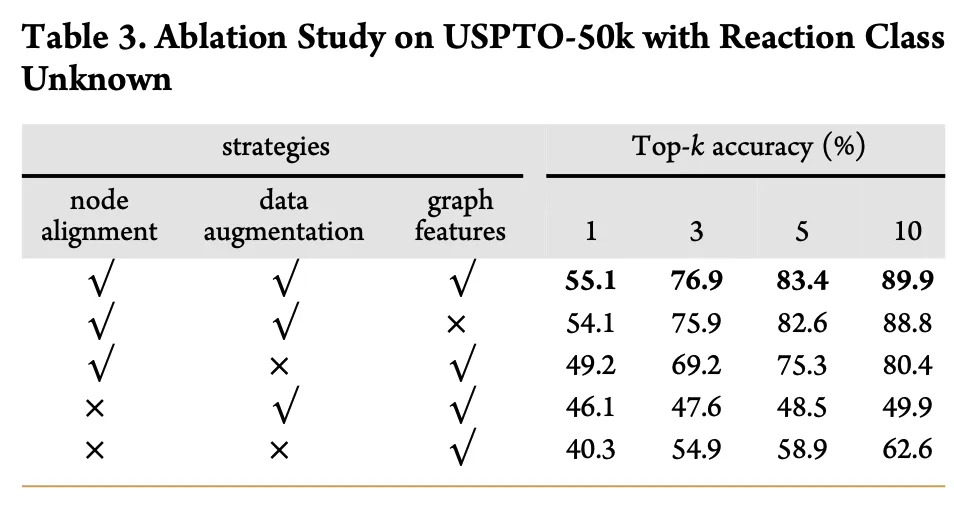 Ablation studies further validate the importance of node alignment, data augmentation, and time-varying graph features in enhancing model performance. By leveraging the Uni-Mol encoder, NAG2G efficiently handles and accurately predicts complex chemical reactions.